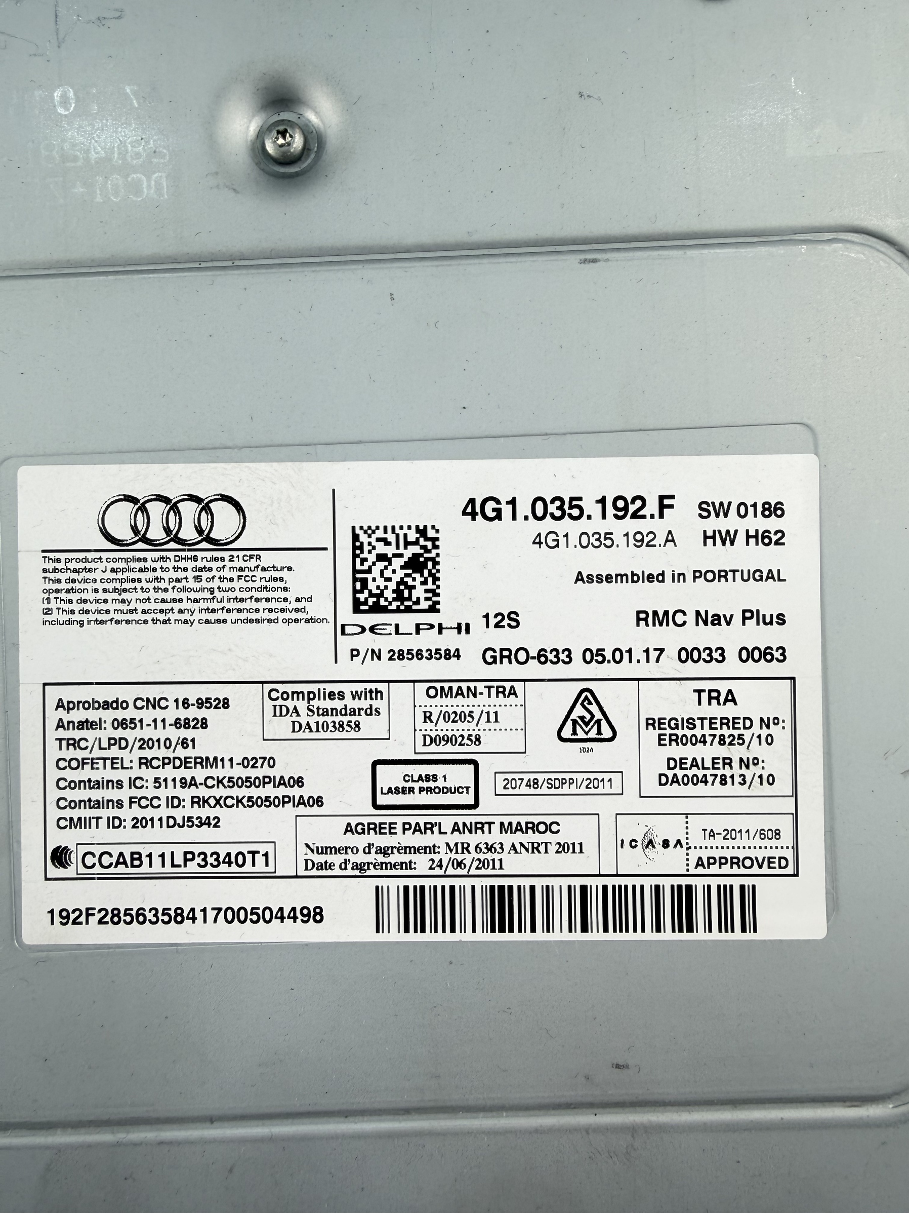 Unidad de control multimedia Audi A6 4G1035192F. Números de piezas de repuesto originales del fabricante o compatibles, incluyendo pero no limitado a las siguientes referencias: 4G1035192F, 4G1035192FX, 4G1035192A.