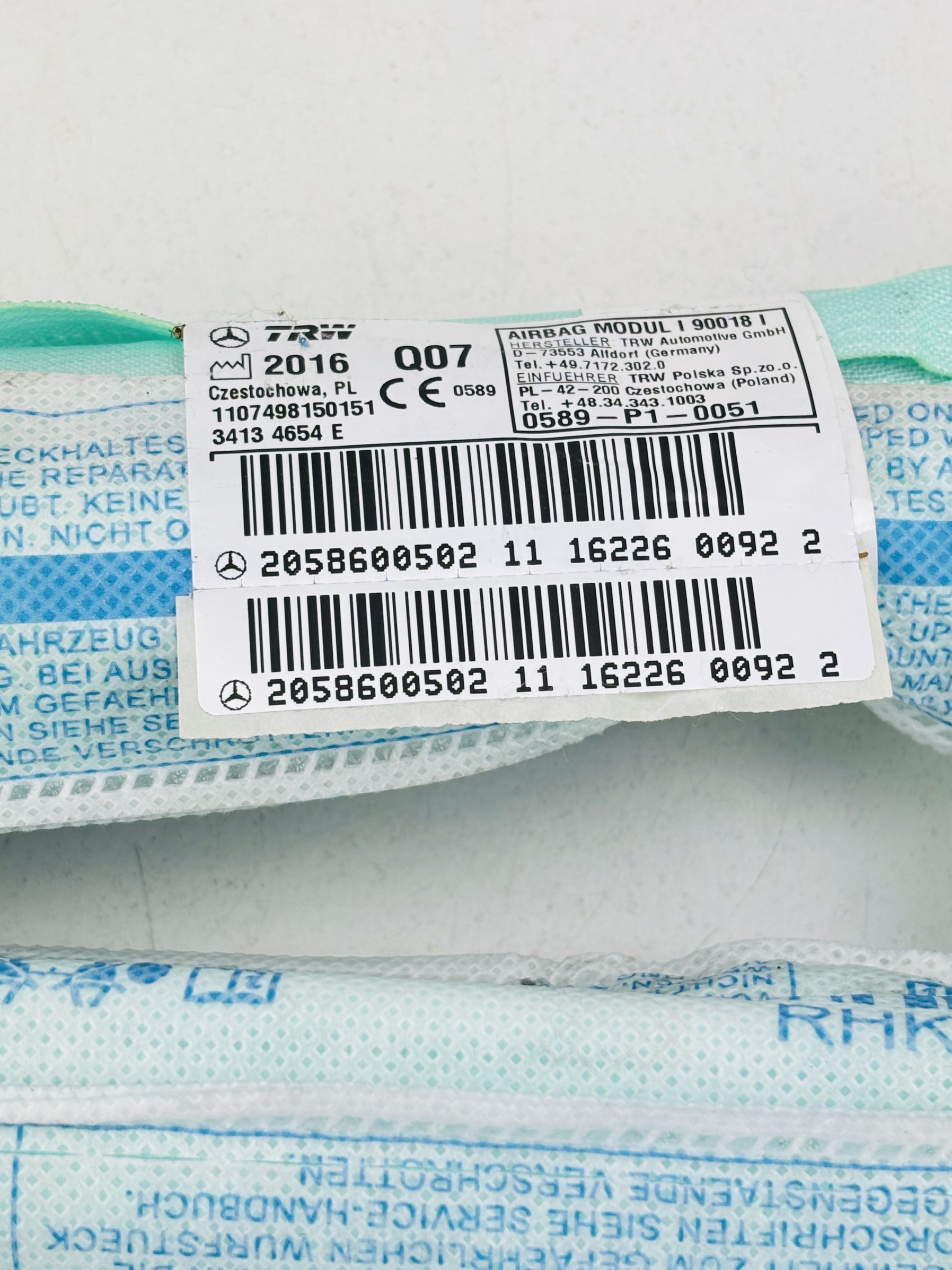Airbag cortina derecho Mercedes-Benz Clase C W205 A2058600502. Números de piezas de repuesto originales del fabricante o compatibles, incluyendo pero no limitado a las siguientes referencias: A2058600502.